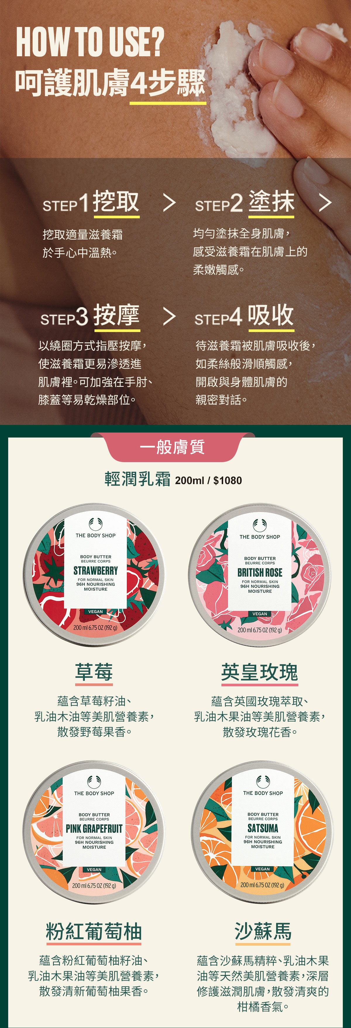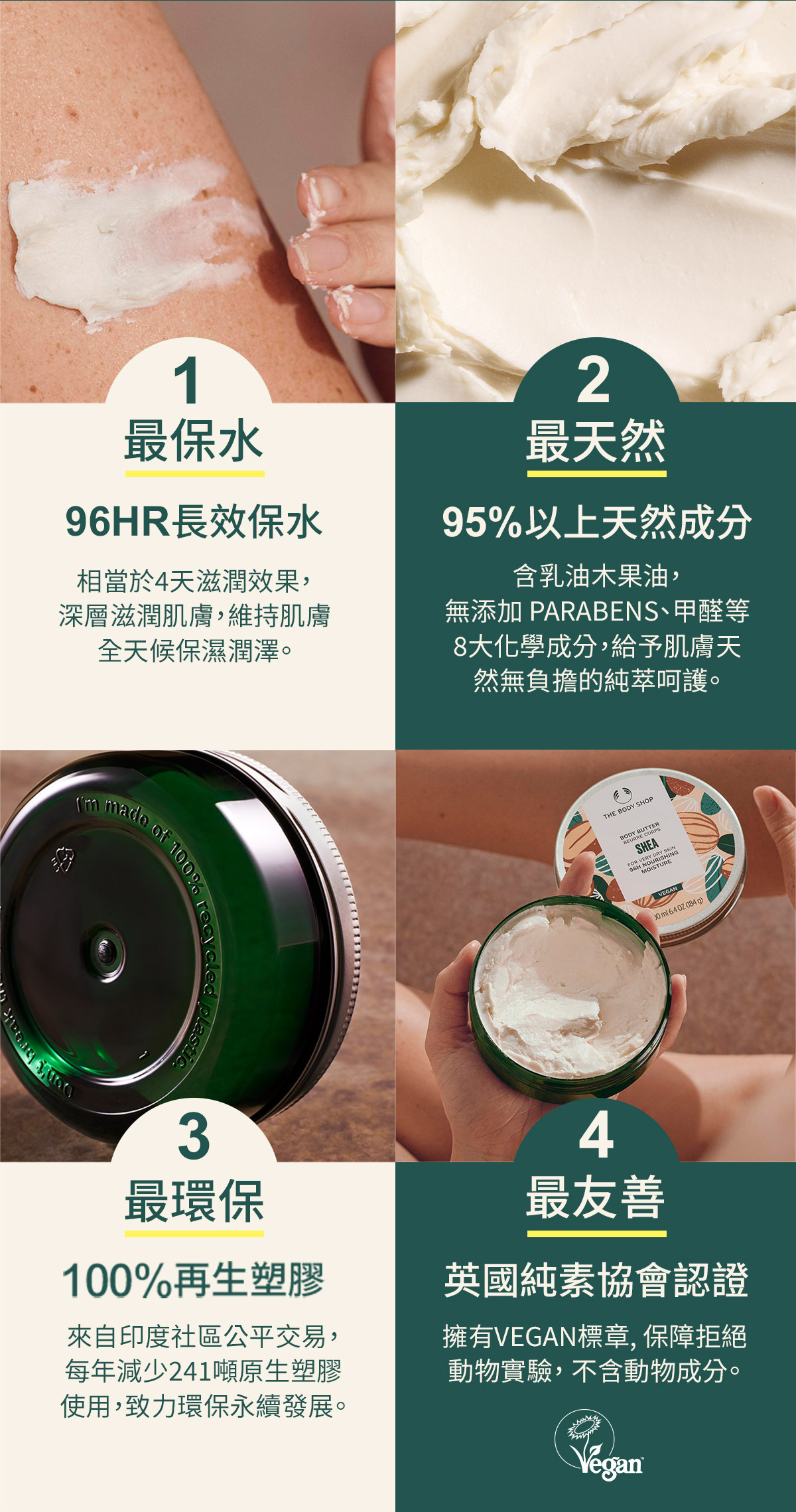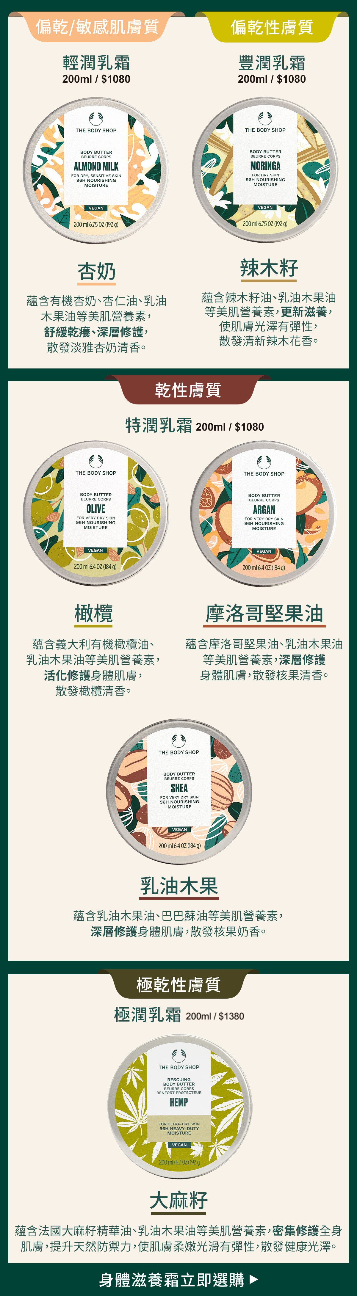 蘊含有機杏奶、杏仁油、乳油木果油、芝麻籽油、可可脂、葵花籽油等美肌營養素,能舒緩乾癢、深層修護全身肌膚,輕潤乳霜質地,維持96小時長效保水。