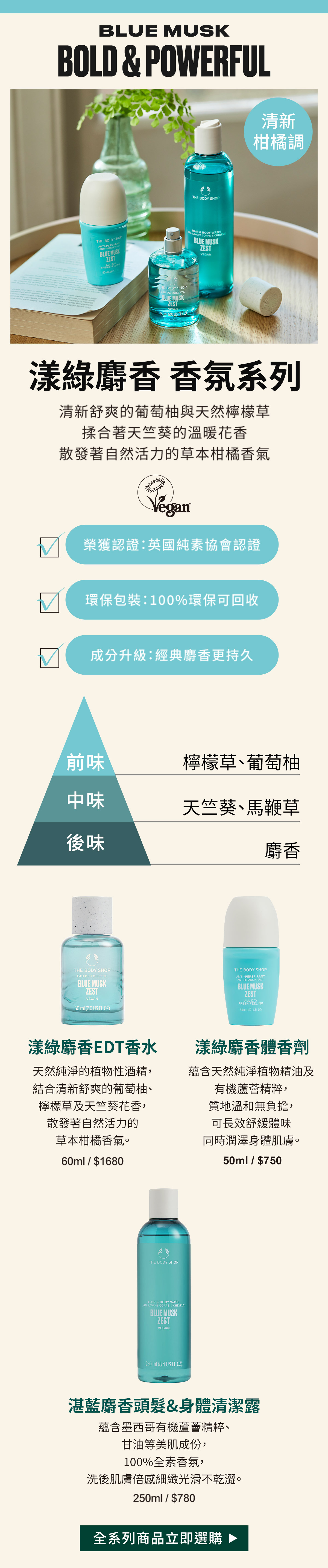 清新舒爽的葡萄柚與天然檸檬草香氣,揉合著天竺葵溫暖花香,尾韻帶著優雅迷人的麝香,使用後全身散發著自然活力的草本柑橘香氣。