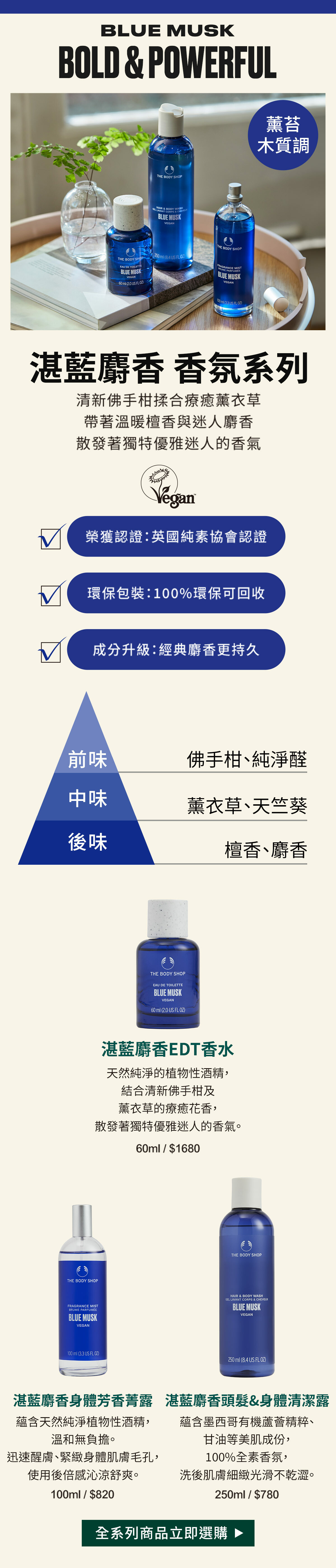 100%全素香氛,能迅速醒膚、鎮靜舒緩全身肌膚,使用後倍感沁涼舒爽,全身散發著獨特優雅迷人的香氣。