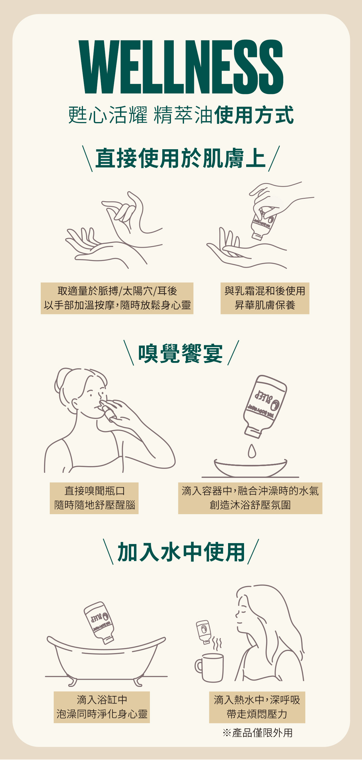 用法:沐浴後取適量均勻按摩肌膚,搭配身體磨砂膏後使用,美膚效果更佳。