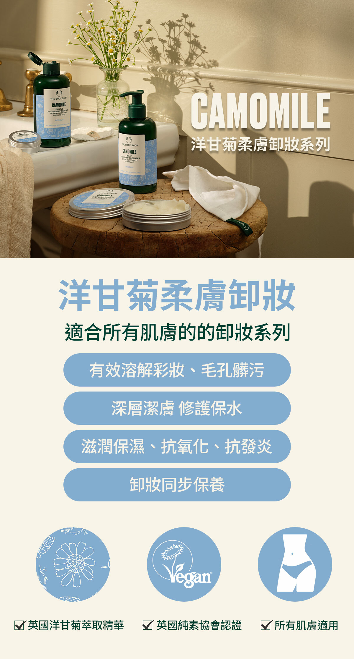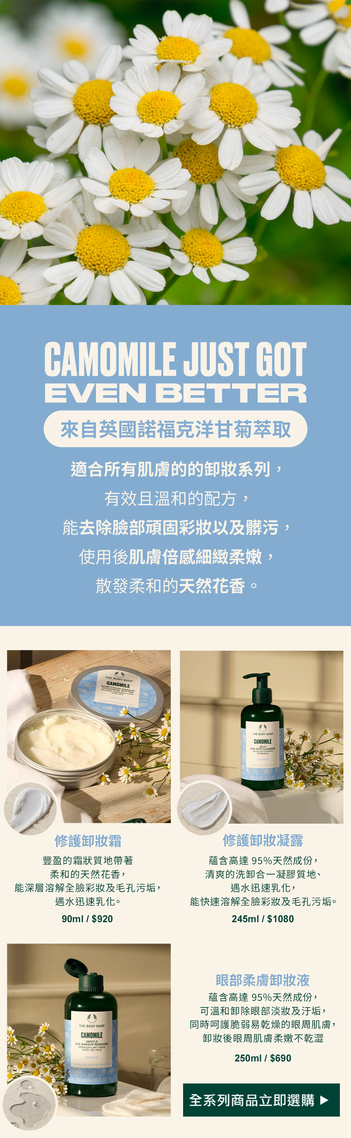 蘊含英國洋甘菊 萃取精華及由社區公平交易取得墨西哥蘆薈萃取精華等高達 95%天然成份,清爽的洗卸合一凝膠質地、遇水迅速乳化,能快速溶解全臉彩妝及毛孔污垢,使肌膚清爽潔淨、柔嫩舒爽、保濕潤澤不乾澀。