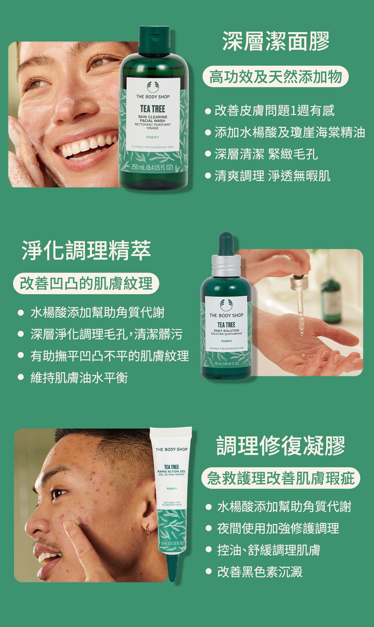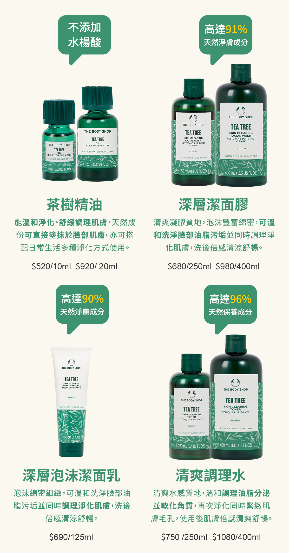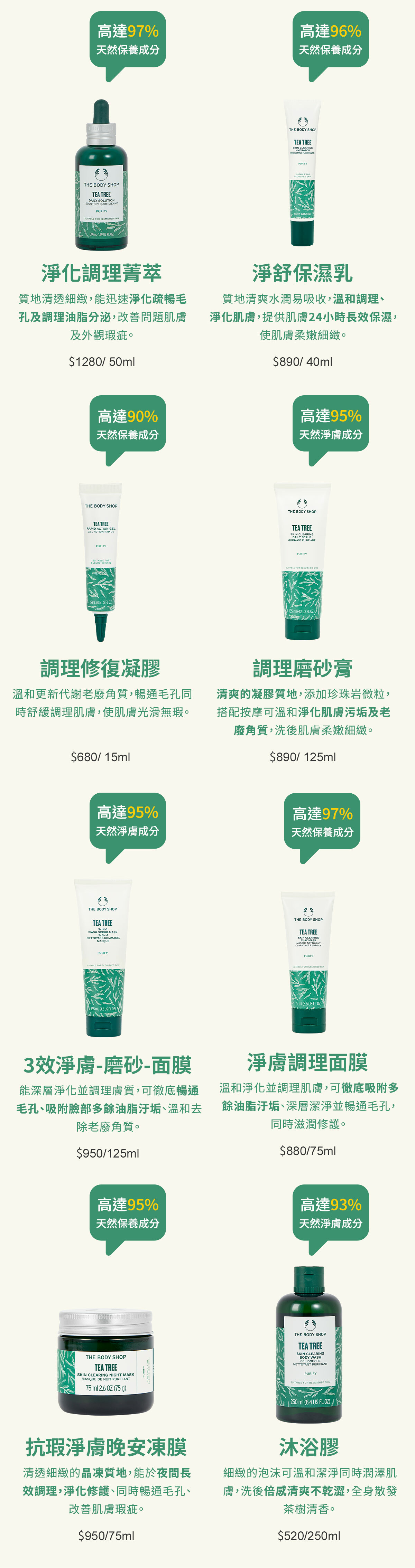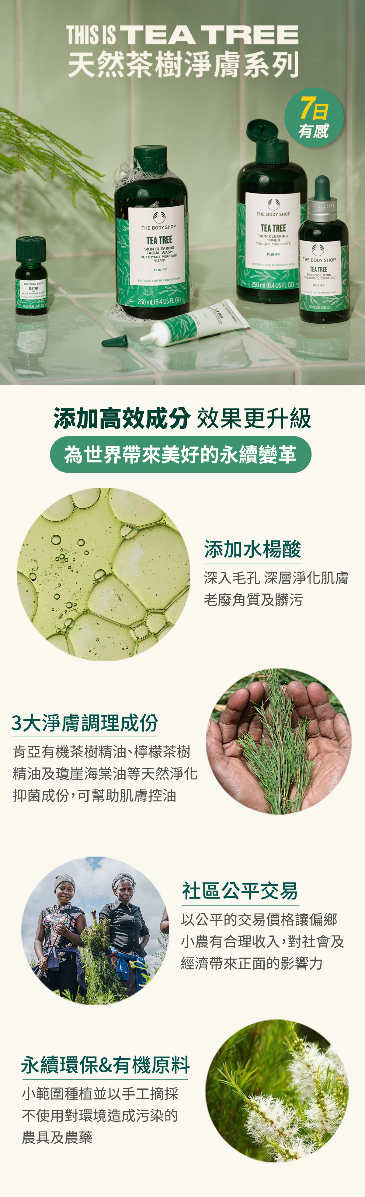 蘊含由社區公平交易取得肯亞有機茶樹精油、檸檬茶樹精油、瓊崖海棠油及蘆薈精萃等高達97%天然保養成份,質地清透細緻,能迅速淨化疏暢毛孔及調理油脂分泌,使用後肌膚倍感清爽舒暢,散發茶樹清香。
