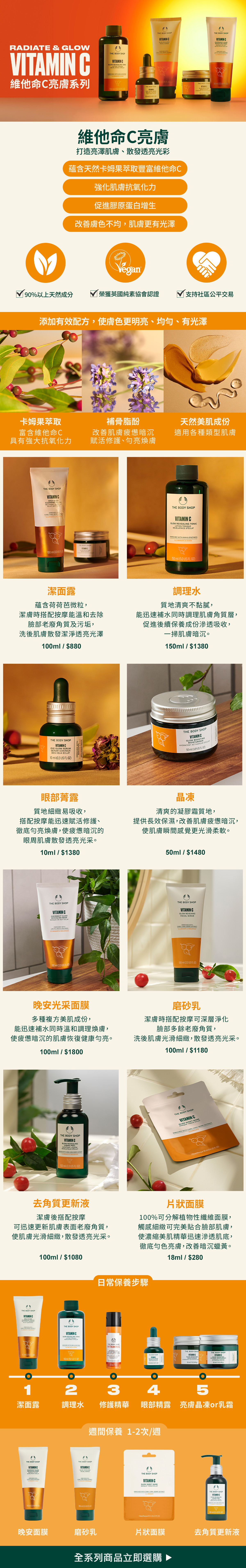 蘊含天然卡姆果萃取豐富維他命 C、有機蘆薈萃取、荷荷芭微粒,潔膚時搭配按摩能溫和去除臉部老廢角質及污垢,洗後肌膚散發潔淨透亮光澤。